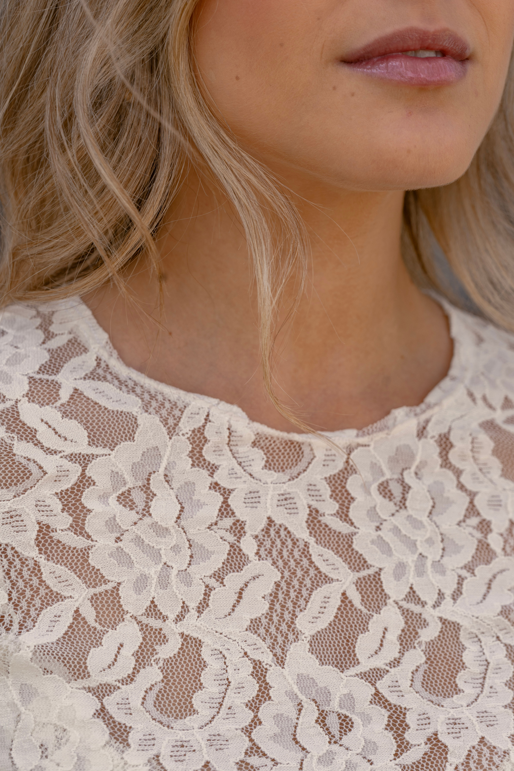 Polera de encaje semi elasticado, con cuello redondo a la cadera.